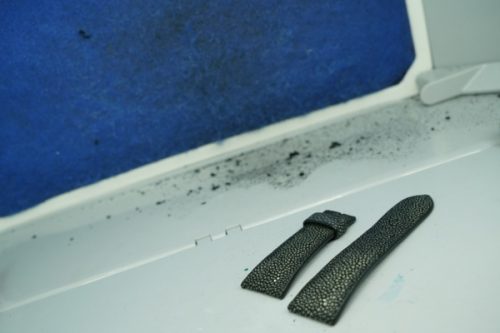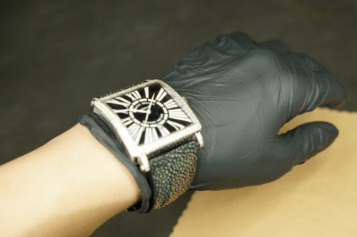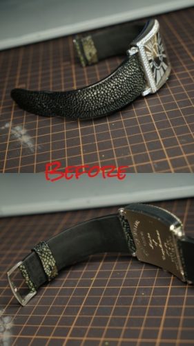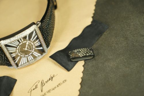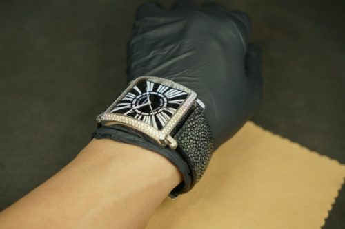 今回お預かりしたのは、フランク・ミュラー「マスタースクエア」に装着された、ガルーシャ製フルオーダーストラップ(数年前に弊アトリエにて制作)です。