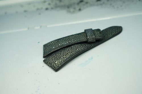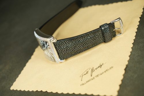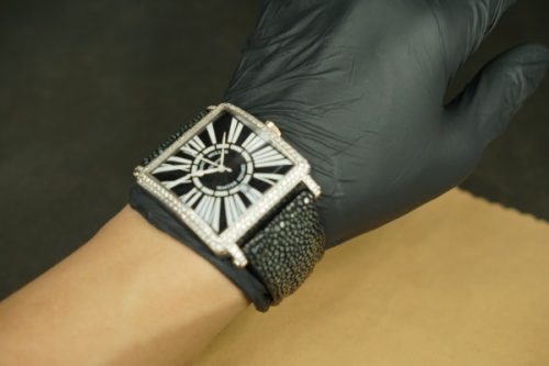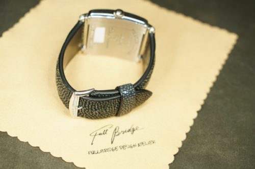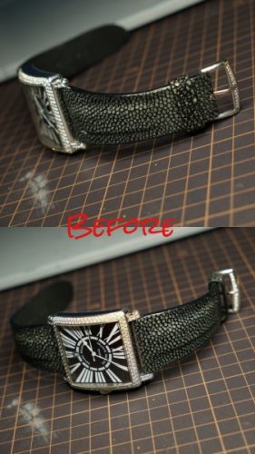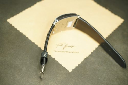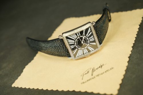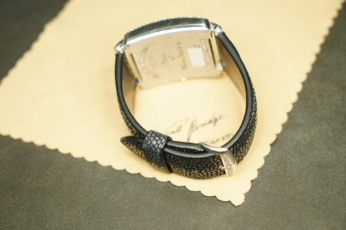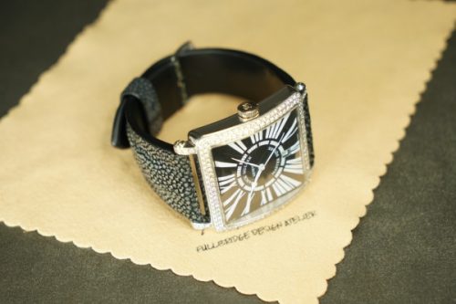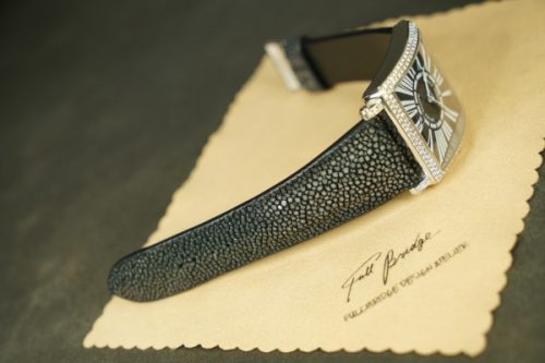 今回お預かりしたのは、フランク・ミュラー「マスタースクエア」に装着された、ガルーシャ製フルオーダーストラップ(数年前に弊アトリエにて制作)です。